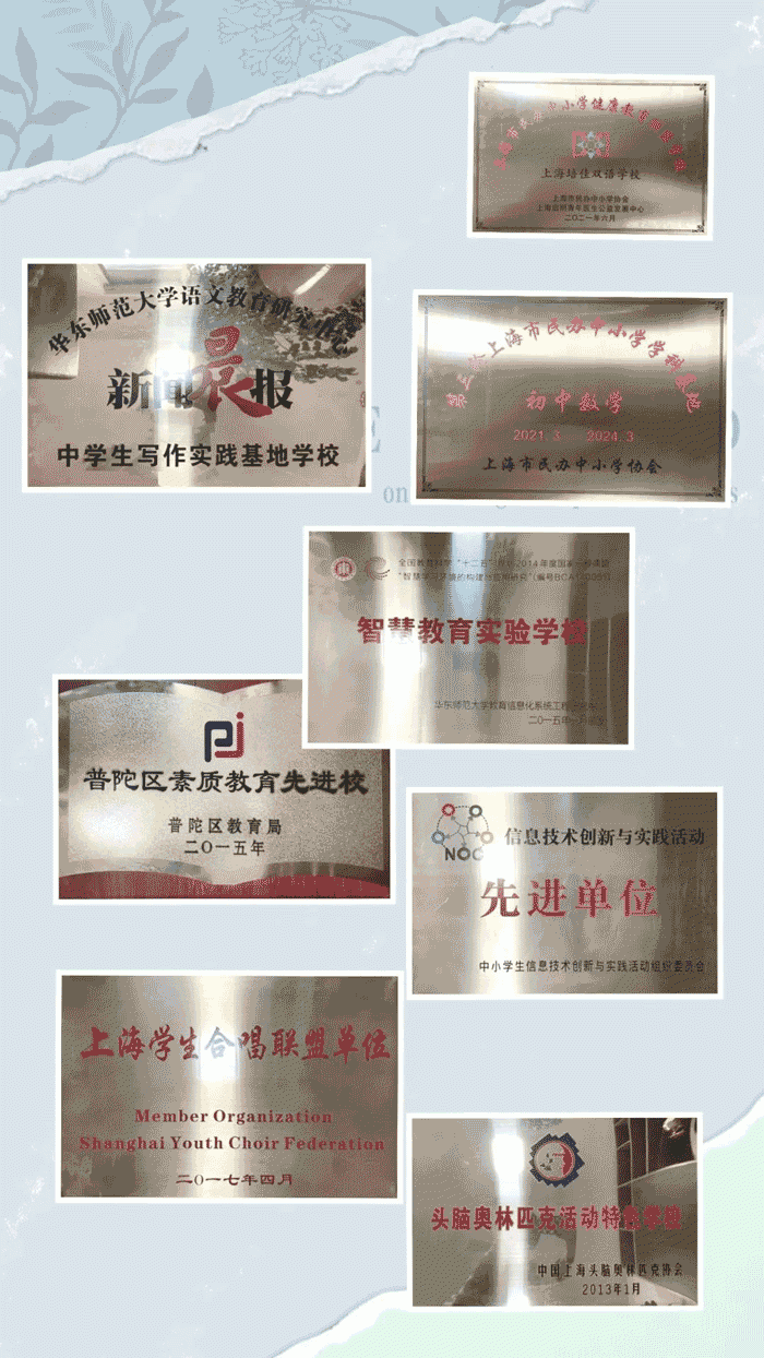 在区政府、教育局的关怀、扶植和全体师生的共同努力下,我校荣获了上海市文明校园、上海市安全文明校园、首批上海市依法治校标准校、上海市民办中小学特色学校、全国五育融合实践联盟校、上海市民办中小学艺术教育联盟校、上海市民办中小学健康教育联盟校、上海市民办中小学科创教育联盟校、上海市民办中小学学科基地、普陀区十佳网络安全示范校、传统美德教育百佳示范学校等荣誉称号!